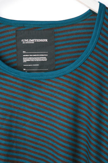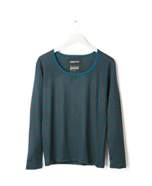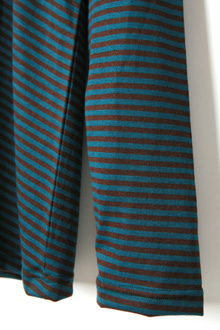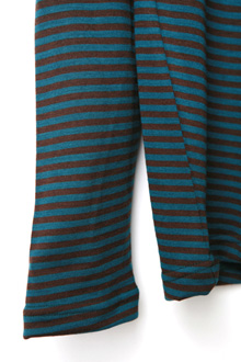 ウール100%のカットソー。 細身のシルエットにウール独特のやわらかいドレープ感が特徴。細ピッチのボーダー柄を斜めに使うことで、上品さがUP ! 適度なネックの開きもポイント。