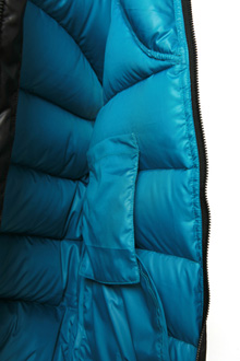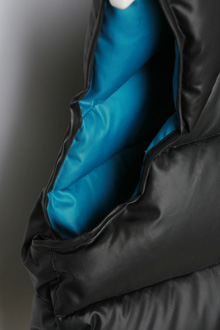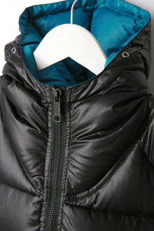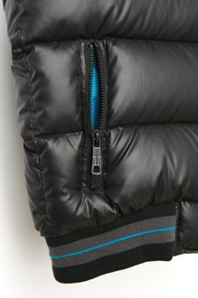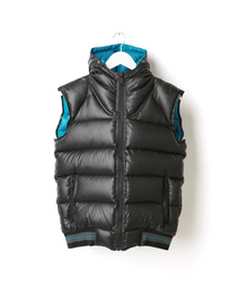 良質のダウンを使用し、保温性に優れたダウンベスト。光沢をおさえた表地のブラック、裏地のブルーといった配色が特徴的。袖と裾のリブに入ったラインなどオリジナリティーあふれる1着。