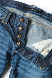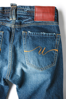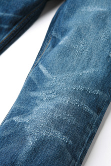 定番のネオデニムのライト加工タイプ。岡山の熟練職人による加工技術で仕上げたヴィンテージ加工が雰囲気溢れる一本です。ヒゲ型から、腿裏のヒゲ型、さらには裾のアタリ感をすべてオリジナルで型を起こして製作したこだわりの1本。