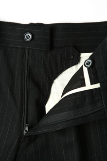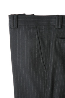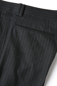 細いピンストライプが特徴のスラックス。カジュアルでもコーディネートに取り入れやすく、オン・オフともに使えるパンツ。ノープリーツで、腰回りもすっきりしたデザイン。バックポケット下にはブランドのエンブレムが刺繍されている。