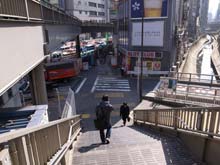 [2]歩道橋を上ったら、右伝いに進みます。歩道橋を降りて右折し、山下書店を右手にして橋を渡ります。